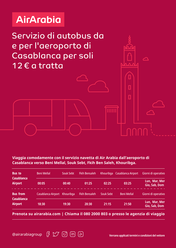 compagnie aeree Air Arabia – Servizio autobus da e per Aeroporto di Casablanca Pubblicato da Italiavola il 19 giugno 2021 Air Arabia ha messo a disposizione questo servizio da e per l’aeroporto di Casablanca. I voli da e per l’Italia sono stati ristabiliti in questi giorni. Condividi: Fai clic per condividere su Facebook (Si apre in una nuova finestra) Facebook Fai clic qui per condividere su LinkedIn (Si apre in una nuova finestra) LinkedIn Fai clic qui per condividere su Reddit (Si apre in una nuova finestra) Reddit Fai clic qui per condividere su Pinterest (Si apre in una nuova finestra) Pinterest Fai clic qui per condividere su Tumblr (Si apre in una nuova finestra) Tumblr Fai clic per condividere su X (Si apre in una nuova finestra) X Mi piace Caricamento... Correlati