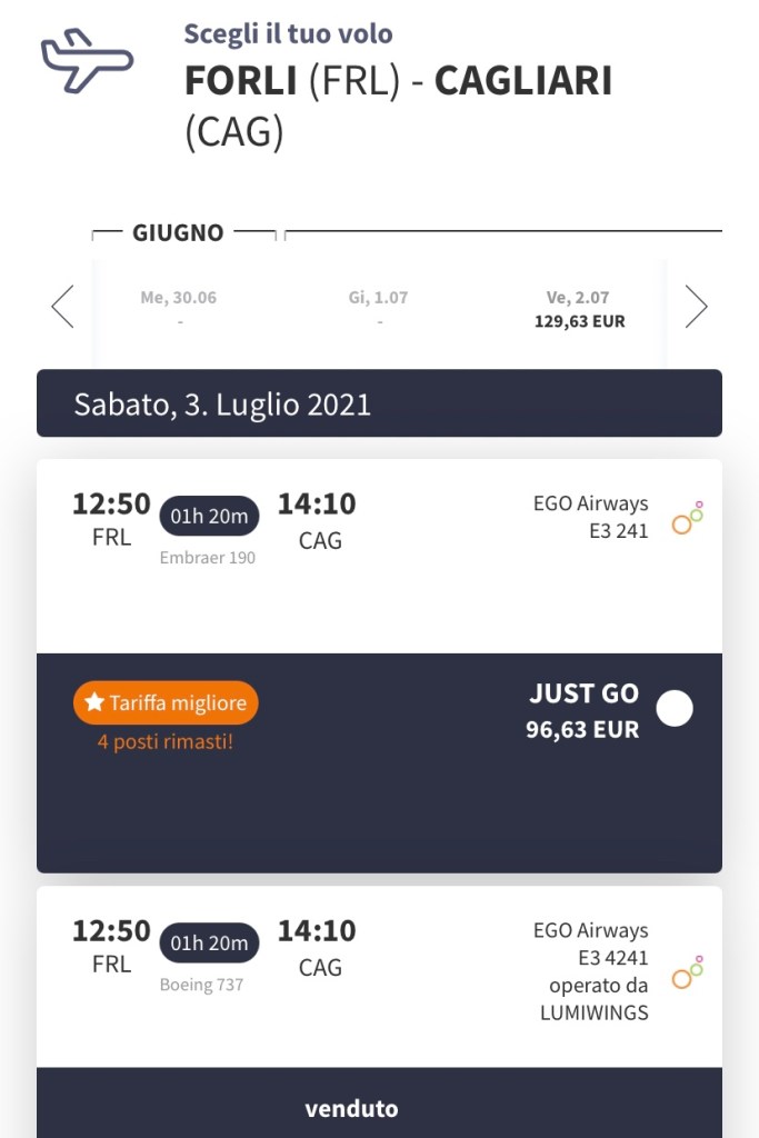 Ego Airways noleggerà un B737 dalla Lumiwings. Come si vede nello screenshot, il volo da Forlì a Cagliari del prossimo 3 luglio, non ancora vendibile, ma e’ già disponibile alla stessa ora di quello operato con E190, con al suo posto il B737 della compagnia aerea greca.
