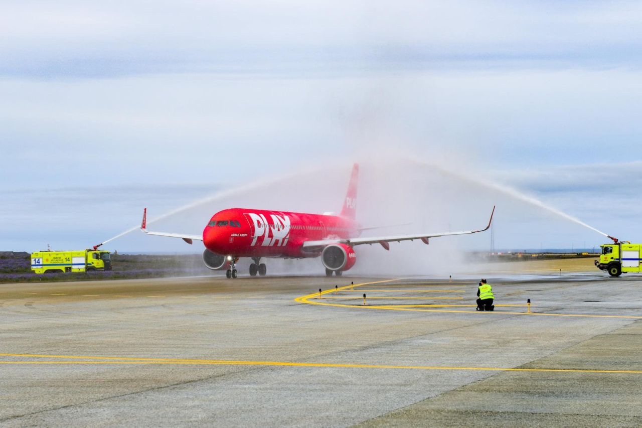 Il taglio del nastro a Reykjavik in Islanda , prima del primo volo e il water cannon salute hanno segnato il decollo ufficiale della PLAY Airlines.