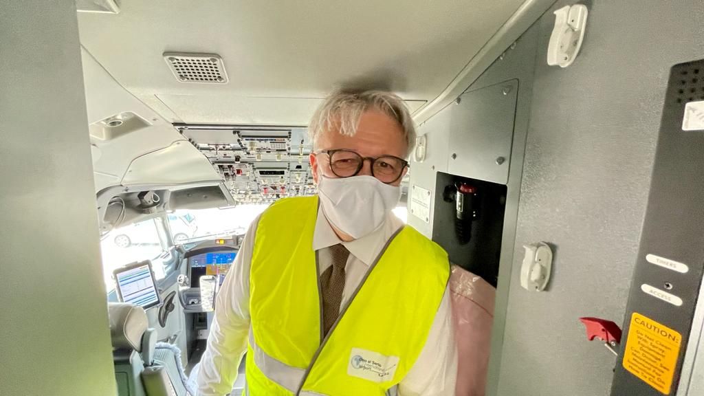 In occasione dell’arrivo del nuovo aeromobile 737-8200 di Ryanair – ora operativo sulle piste dell’Aeroporto di Milano Bergamo – il Direttore Generale di SACBO Emilio Bellingardi ha dato il benvenuto al velivolo con una breve visita al suo interno, per un informale saluto ai piloti e al personale di bordo: una piccola occasione di incontro e scambio con i lavoratori in volo.