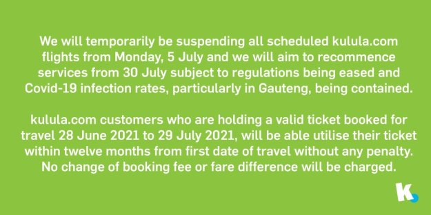 I voli saranno sospesi da lunedì 5 luglio 2021 e Comair mira a riprendere i servizi dal 30 luglio a condizione che le normative vengano allentate e i tassi di infezione da Covid-19, in particolare nel Gauteng, siano contenuti.
