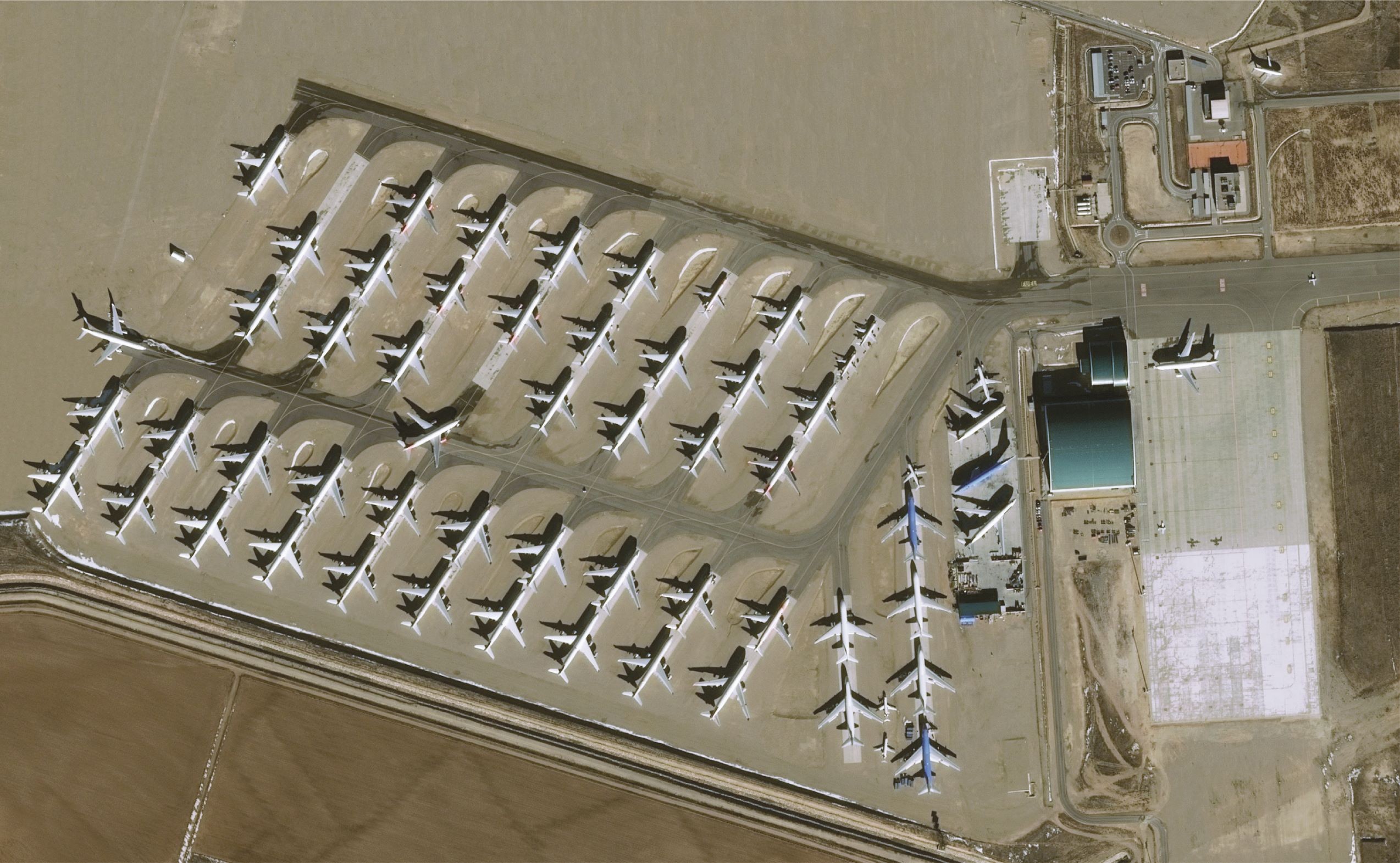 Nella foto di questa azienda l’impressionante numero di velivolii fermi. La società offre non solo la sosta, ma anche tutta l’assistenza tecnica necessaria che i clienti richiedono al fine di mantenere l’aereo pronto eventualmente a partire.