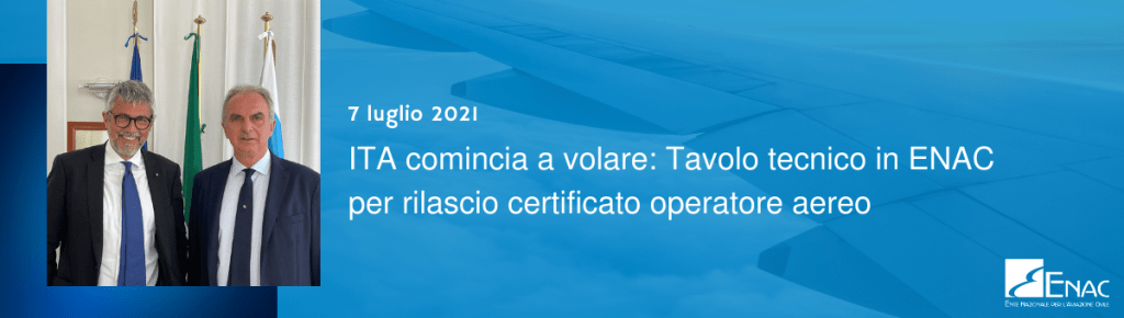 Oggi, 7 luglio 2021, nell’ambito della procedura di rilascio del Certificato di Operatore Aereo (COA) alla neo compagnia aerea ITA (Italia Trasporto Aereo), si è svolta una significativa riunione del tavolo tecnico ENAC – ITA, presieduto dal Direttore Centrale Vigilanza Tecnica ENAC, ing Claudio Eminente, nella quale l’operatore ha finalizzato l’organizzazione e le principali figure che saranno responsabili degli aspetti di safety.