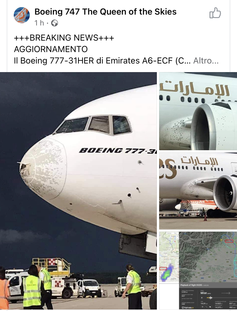 Pesantemente danneggiato il Boeing 777-31H ser della Emirates, che dopo il decollo ha trovato sulla sua rotta la grandine.