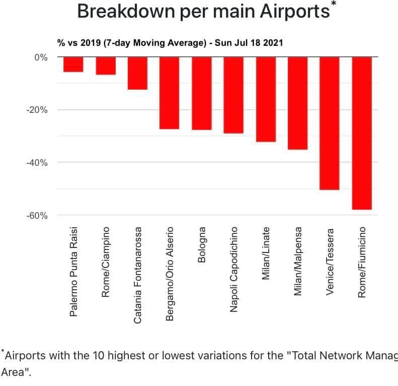 Domenica 18, a Palermo si sono registrati un numero di voli leggermente superiore al 2019. Poi segue Catania e Roma Ciampino sopra il -10% come pure Bergamo , Napoli e Bologna. Milano Linate e’ poco più del -20%, poi Milano Malpensa che si trova oltre il -30%. Venezia e Roma Fiumicino oltre il -50%.