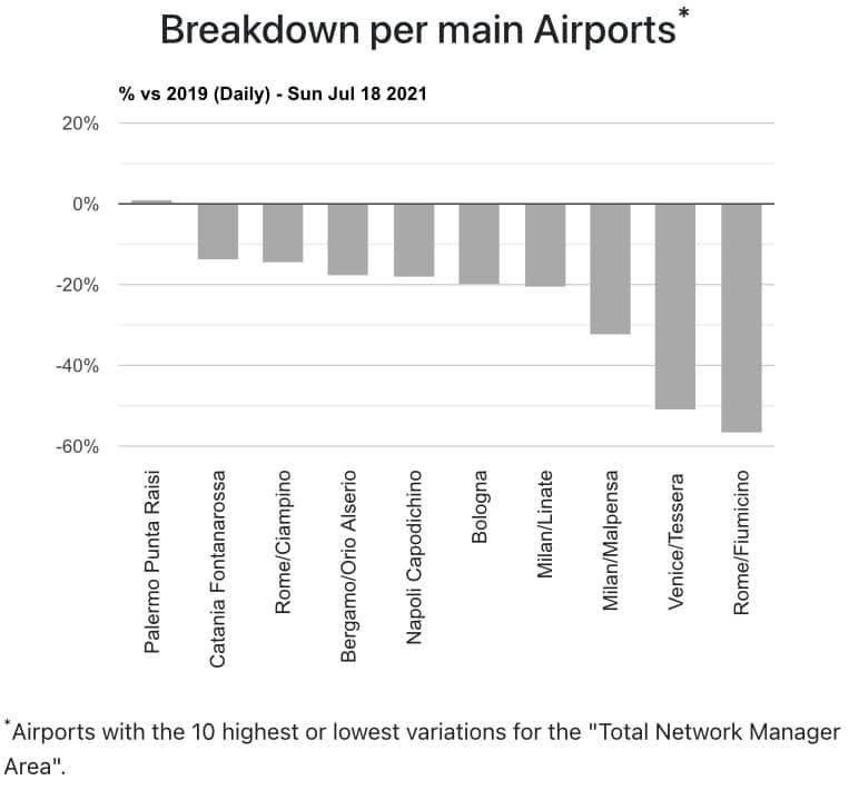 Domenica 18, a Palermo si sono registrati un numero di voli leggermente superiore al 2019. Poi segue Catania e Roma Ciampino sopra il -10% come pure Bergamo , Napoli e Bologna. Milano Linate e’ poco più del -20%, poi Milano Malpensa che si trova oltre il -30%. Venezia e Roma Fiumicino oltre il -50%.