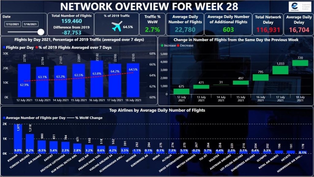 -35,5% e’ il divario di movimenti con il 2019. Questo e’ quanto registrato nella settimana numero 28 del 2021 con le statistiche, come al solito precisissime di Eurocontrol.