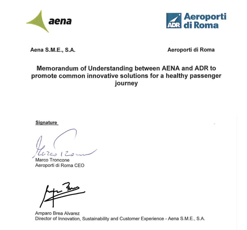 “Siamo felici di collaborare con il nostro partner internazionale Aena su un’iniziativa così cruciale per il nostro settore”, ha dichiarato Marco Troncone, Amministratore delegato di Aeroporti di Roma. “Fin dalle prime fasi della pandemia, ADR ha investito costantemente nell’applicazione di nuove soluzioni per fornire ai passeggeri l’esperienza più sicura possibile per quanto riguarda la salute e allo stesso tempo supportare il rilancio del settore aeronautico: non solo abbiamo implementato misure di sicurezza grazie alle quali abbiamo ricevuto il riconoscimento di organismi internazionali quali Skytrax e UNWTO, ma abbiamo anche lavorato incessantemente per essere pionieri nel lancio dei protocolli di volo Covid-tested, ora diffuso a livello mondiale. Insieme alla sostenibilità, l’innovazione rappresenta uno dei nostri focus principali: dalle tecnologie biometriche all’open innovation, tema che stiamo costantemente promuovendo all’interno della nostra azienda, siamo entusiasti di poterci confrontare con Aena ed elaborare insieme nuove idee che possano servire tutto il settore».