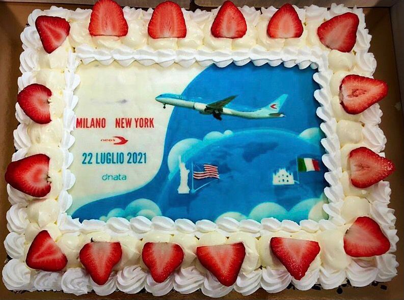 Un Boeing 787-9 della Neos che vola e sotto a sinistra la Statua della Libertà e il Duomo di Milano. Ecco i temi che vedete sulla torta che e’ stata preparata per il lancio del primo volo tra Milano Malpensa e New York JFK.
