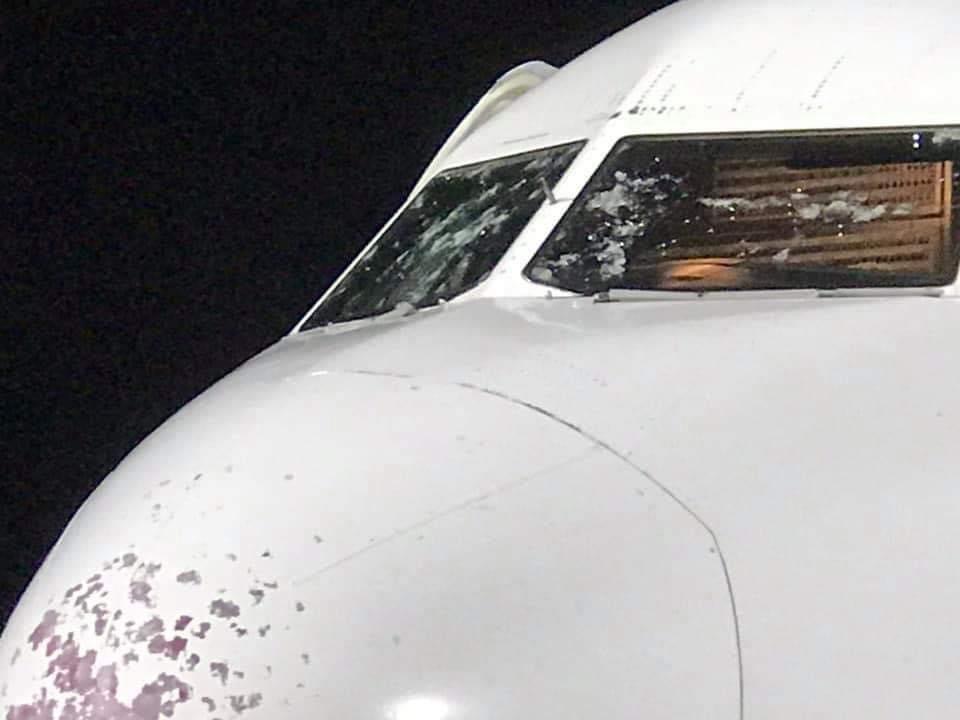 Il radome del radar e i blindovetri del cockpit mostrano i chiari segni degli impatti su quelle superfici.