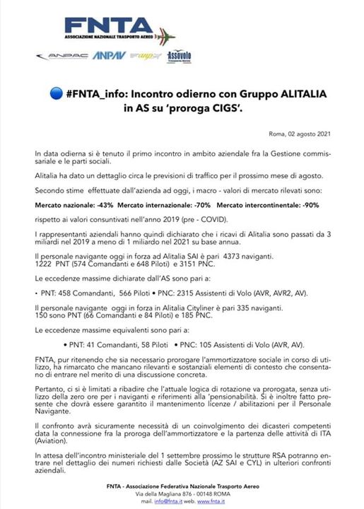 In un incontro avuto tra FNTA con Alitalia sono stati rivelati i dati commerciali riguardanti il mese di agosto.