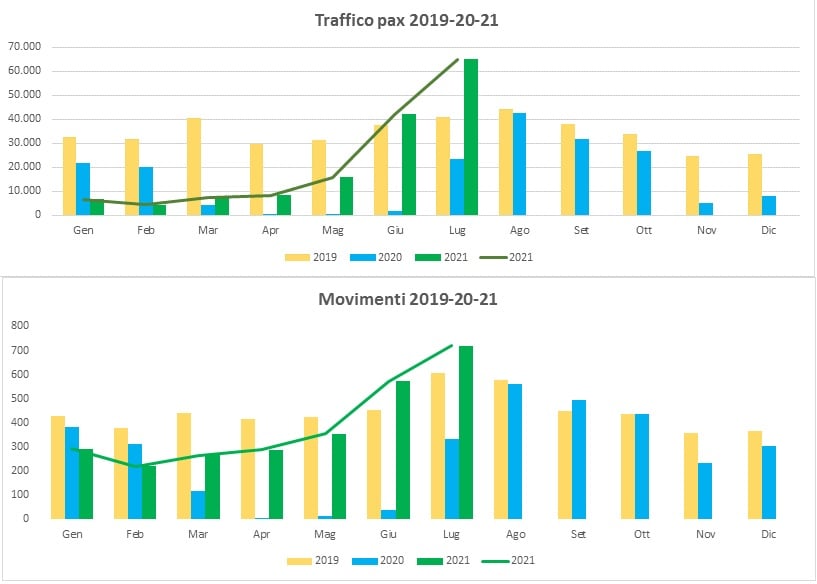 I dati di luglio dell’Aeroporto Vincenzo Florio di Trapani Birgi superano le più rosee previsioni, superando quelli dello stesso periodo del 2019, sia in termini di movimenti (+21%) sia di passeggeri +60% (il 2020 non fa testo a causa del Covid).
