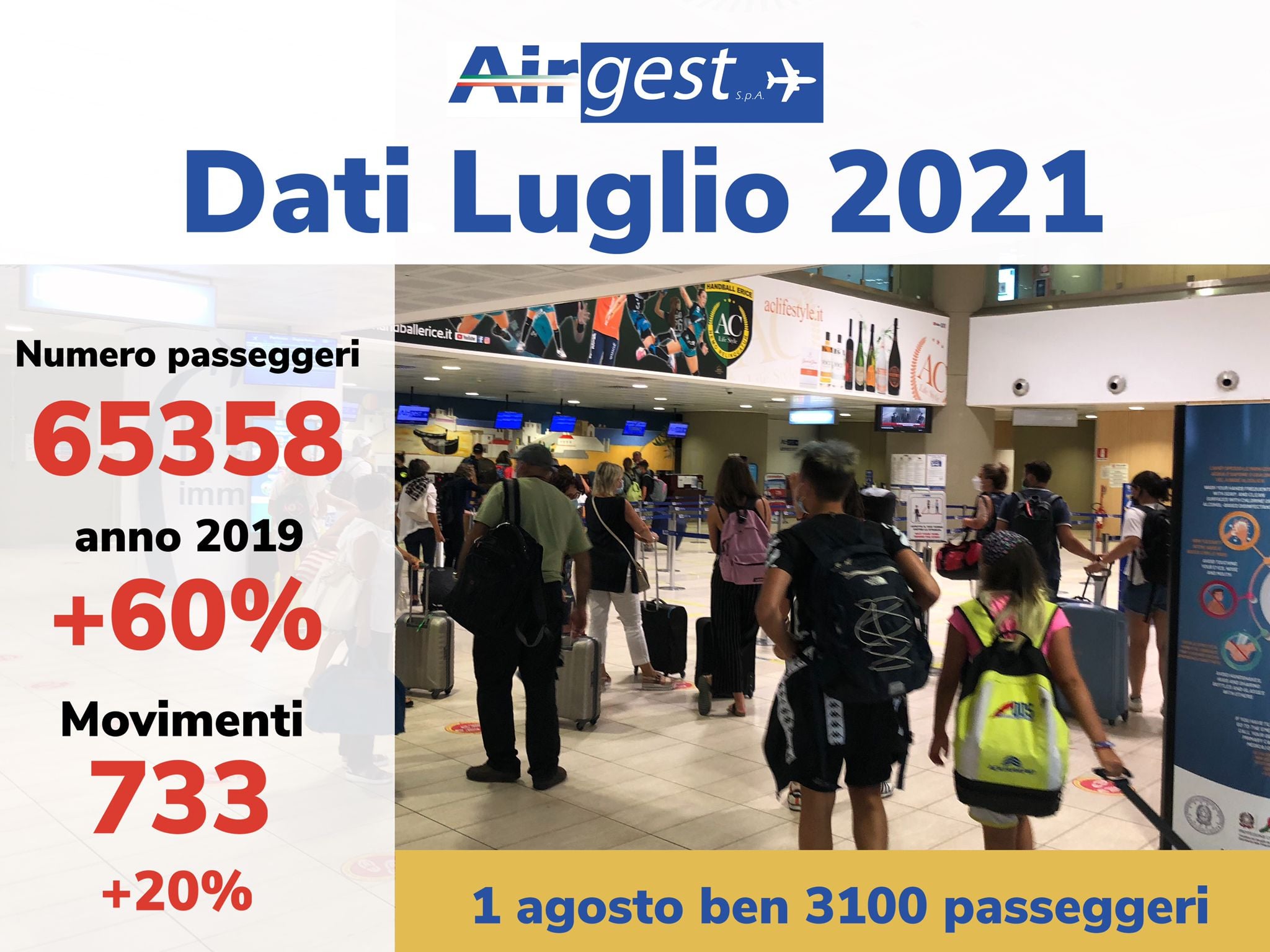 I dati di luglio dell’Aeroporto Vincenzo Florio di Trapani Birgi superano le più rosee previsioni, superando quelli dello stesso periodo del 2019, sia in termini di movimenti (+21%) sia di passeggeri +60% (il 2020 non fa testo a causa del Covid).