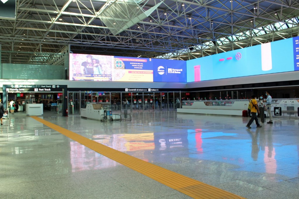 L’area check-in del Terminal 1 riapre al traffico in una configurazione del tutto rinnovata (zona di circolazione e di accodamento pre controlli sicurezza rispettivamente aumentate del 13% ed oltre il 360% rispetto a com’era prima il Terminal 1). L’incremento dell’area di circolazione, in sinergia con la riapertura dei 124 banchi check-in del Terminal 1, permette di ospitare ulteriori 17.000 passeggeri in partenza nelle condizioni di distanziamento sociale attualmente in vigore. Ad accompagnare il percorso dei passeggeri dal check-in ai controlli di sicurezza è presente anche un impianto ledwall lungo circa 130m (600 mq), per il quale studenti e docenti di AANT (Accademia delle Arti e delle Nuove Tecnologie) hanno realizzato la campagna multimediale “Italian History/ Italian Stories” che racconta, con suggestioni visive l’ Italian way of life, esortando a volare di nuovo e tornare a connettersi. L’iniziativa vuole promuovere la bellezza del nostro Paese con la valorizzazione del lavoro di giovani talenti che esprimono l’eccellenza italiana nelle arti e rientra nella nuova strategia di innovazione di Aeroporti di Roma.