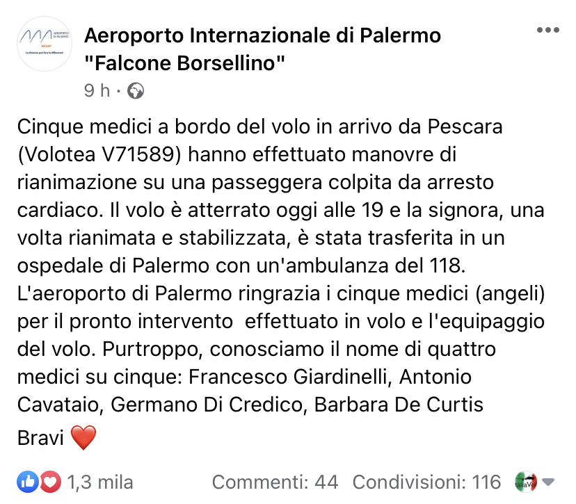Ci sembra doveroso dare spazio a questo gesto compiuto dall’aeroporto di Palermo, che ringrazia chi nella giornata di ieri ha salvato una vita colpita da un arresto cardiaco sul volo Pescara – Palermo della Volotea.
