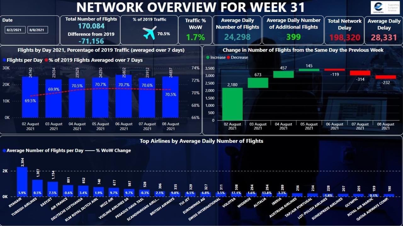 La settimana 31 chiusasi domenica scorsa 8 agosto mostra un andamento positivo, il traffico continua a recuperare volumi e rispetto al 2019 e’ al -29,5%. Per la prima volta si chiude sotto il -30%.