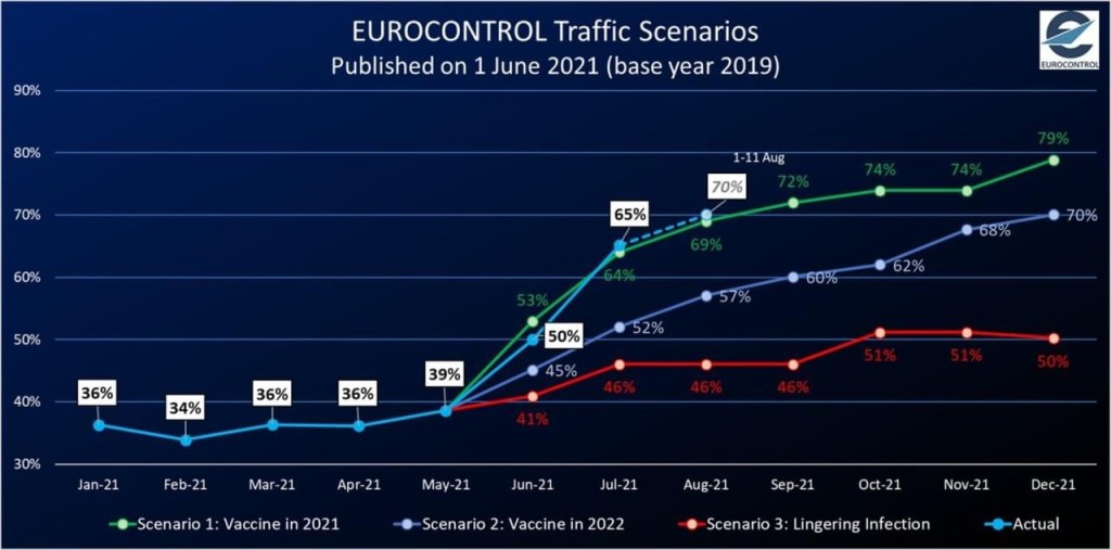La curva dei dati sul traffico aereo registrato in Europa, riferiti alla giornata di ieri, e’ un punto percentuale sopra lo scenario numero uno con le previsioni aggiornate a giugno 2021. Ma come sarà quest’autunno/inverno? Crescerà, oppure diminuirà?