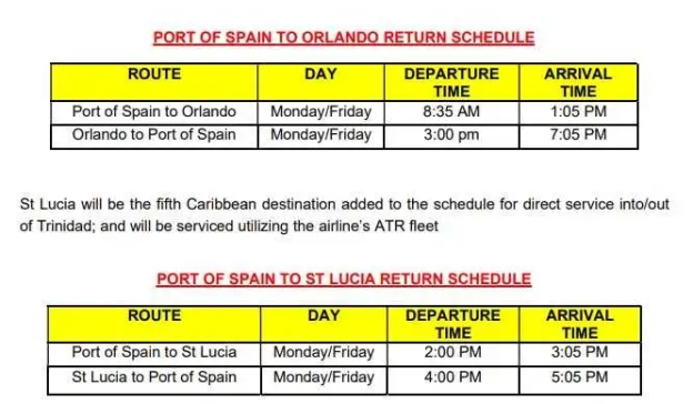 I voli per Orlando e St Lucia opereranno due volte alla settimana, ogni lunedì e venerdì con servizi di ritorno nello stesso giorno.
