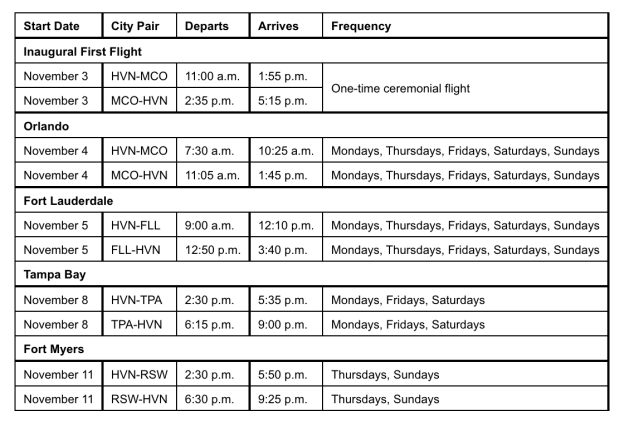 A partire dal 3 novembre 2021 Avelo opererà voli non-stop dalla sua prima base sulla costa orientale di HVN all’aeroporto internazionale di Fort Lauderdale-Hollywood (FLL), all’aeroporto internazionale della Florida sudoccidentale di Fort Myers (RSW), all’aeroporto internazionale di Orlando (MCO) e all’aeroporto internazionale di Tampa. (TPA).