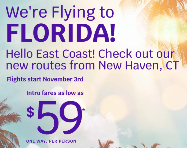 Avelo Airlines ha annunciato oggi che lancerà il servizio questo autunno verso quattro famose destinazioni della Florida dall’aeroporto più comodo e rilassante del Connecticut: l’aeroporto di Tweed-New Haven (HVN).