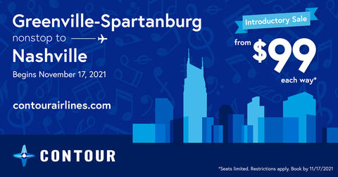 Contour Airlines ha annunciato un servizio non-stop tra Greenville-Spartanburg (GSP) e Nashville a partire dal 17 novembre 2021.