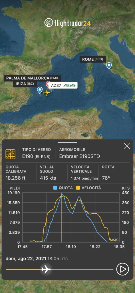 Il volo AZ87 Ibiza – Roma di questo pomeriggio con aeromobile E190 EI-RNB e’ atterrato fuori programma a Palma de Maiorca.