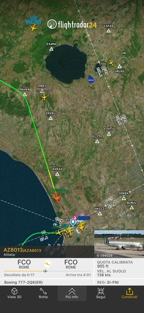 Una ventina di minuti scarsi in cielo per il Boeing 777-2Q8ER EI-FNI. E’ un velivolo di Alitalia decollato da Roma Fiumicino, oramai fuori flotta con buona parte della livrea mancante e i titoli assenti. Non e’ stato ancora restituito al lessor, il volo e’ stato operato con codice di volo e numeri Alitalia, AZ8013. L’ultimo volo fu il 6 agosto scorso.