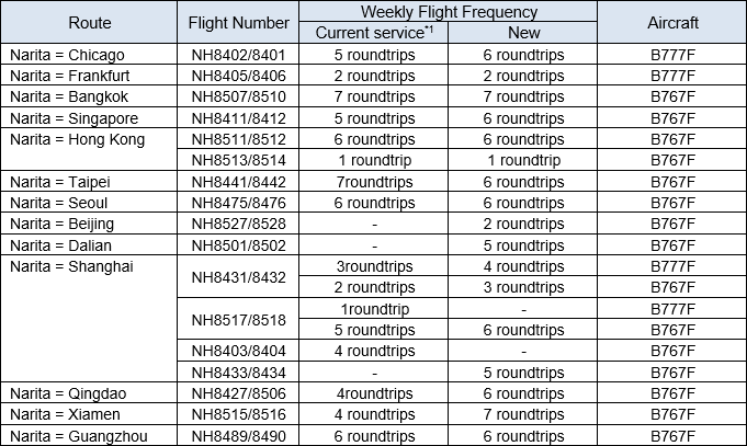 • Apportando modifiche come il trasferimento delle rotte Tokyo Haneda-Washington DC e Tokyo Haneda-Houston all’aeroporto di Tokyo Narita, ANA mira a soddisfare la domanda di collegamenti tra l’Asia-Nord America massimizzando contemporaneamente i ricavi per volo sia passeggeri che merci operazioni. ANA continuerà a rispondere in modo flessibile alla domanda riesaminando il nostro programma di volo su base mensile.