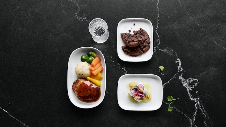 I pasti sui voli a lungo raggio sono un’ottima combinazione di tradizione e nuove esperienze rinfrescanti. Prima del pasto vero e proprio, i passeggeri possono fare uno spuntino con un piccolo antipasto. L’antipasto è una combinazione di tre diversi elementi in cui la Scandinavia incontra i sapori piccanti dell’Asia.