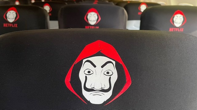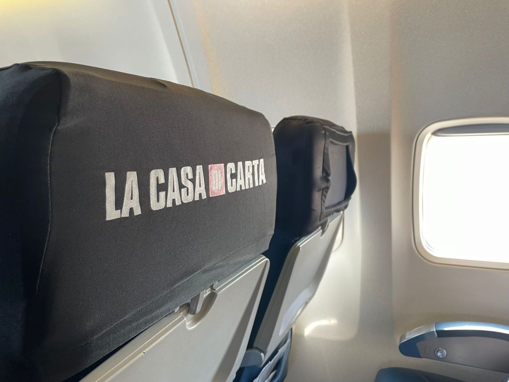 Pochi invitati, un centinaio su 170 posti di capacità del velivolo. Non essendo equipaggiato con sistemi IFE, la scelta e’ ricaduta sugli iPad. Su questi device della Apple e’ stato caricato il contenuto della quinta edizione de La Casa di Carta di Netflix. I tablet sono stati posizionati in una sacca incorporata all parte superiore del sedile, si vede nell’immagine sotto nel posto lato finestrino.
