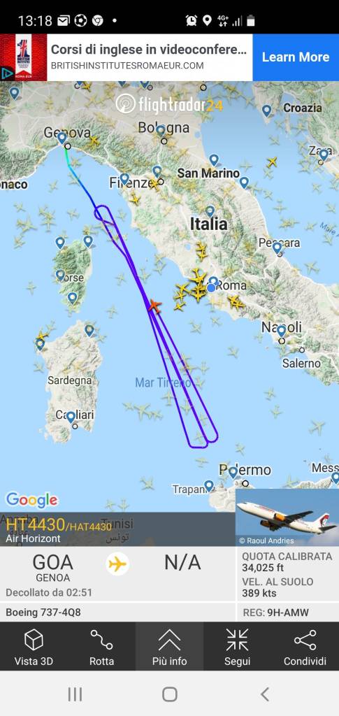 L’aereo ha percorso per alcune volte il Mar Tirreno e quello Ligure in lungo in largo fino alla Sicilia.