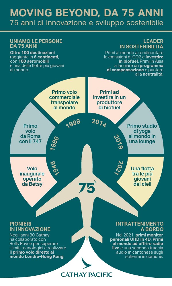 Il 24 settembre Cathay Pacific, la quarta compagnia aerea più longevaal mondo,festeggia il suo 75° anniversarioripercorrendole tappe e itraguardi della sua evoluzione.