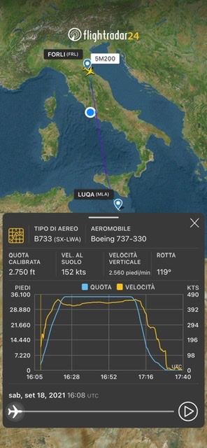 Nel tardo pomeriggio di oggi la Lumiwings ha trasferito da Forli a Malta il Boeing 737/330 SX-LWA con codice e numero di volo 5M200.