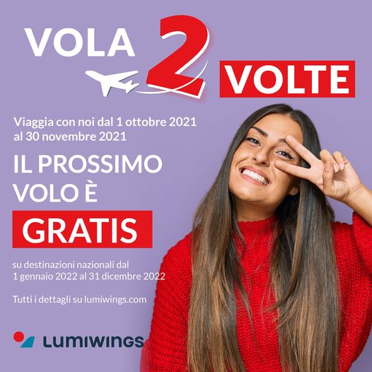 - Il biglietto gratuito è valido per un volo e una sola tratta, su tutti i voli NAZIONALI LUMIWINGS ( I voli internazionali non rientrano nell’offerta).