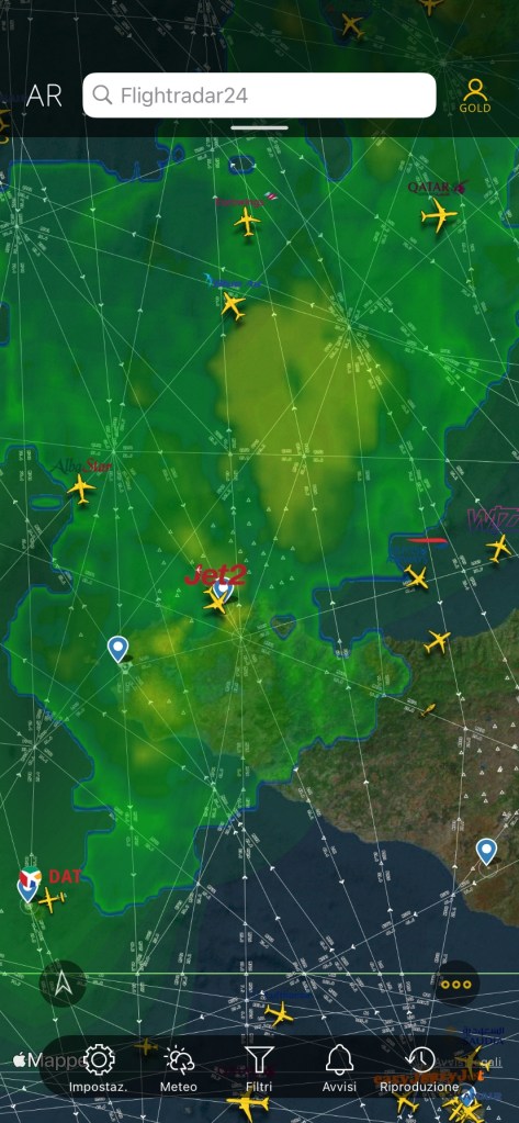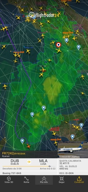 Le deviazioni di rotta sono significative. Un esempio e’ questo volo Ryanair da Dublino per Malta che fa lo slalom per evitare la situazione meteorologica avversa.