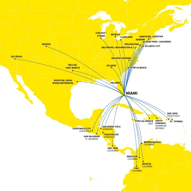 La presenza di Spirit al MIA inizia con il servizio verso nove destinazioni, che cresceranno fino a 31 opzioni non-stop al termine delle espansioni di novembre e gennaio. Il vettore servirà 20 mercati a livello nazionale e 11 a livello internazionale.