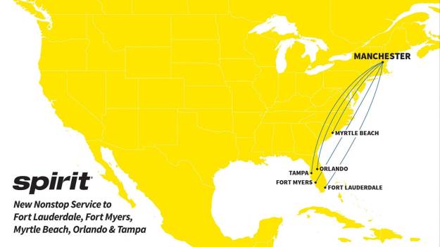 Il servizio non-stop di Spirit per l’aeroporto internazionale di Fort Lauderdale/Hollywood (FLL) e l’aeroporto internazionale di Orlando (MCO) da MHT è iniziato il 7 ottobre. In sole sei settimane, il servizio non-stop di Spirit per l’aeroporto internazionale Southwest Florida di Fort Myers (RSW) e l’aeroporto internazionale di Tampa (TPA) inizierà rispettivamente il 17 e 18 novembre.