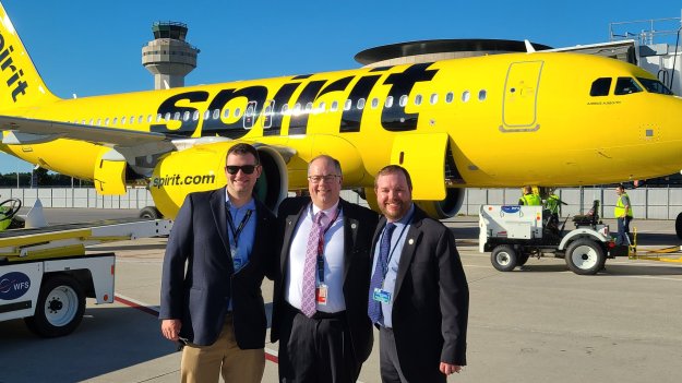 Alle 16:30, tutti gli occhi si sono voltati all’esterno per guardare il primo aereo di Spirit atterrare. L’aereo, in arrivo da Fort Lauderdale, ha ricevuto un “water cannon salute”, un tradizionale benvenuto in aeroporto per nuove compagnie aeree o rotte. I membri dello Spirit Team hanno assistito al taglio del nastro al Gate 1.