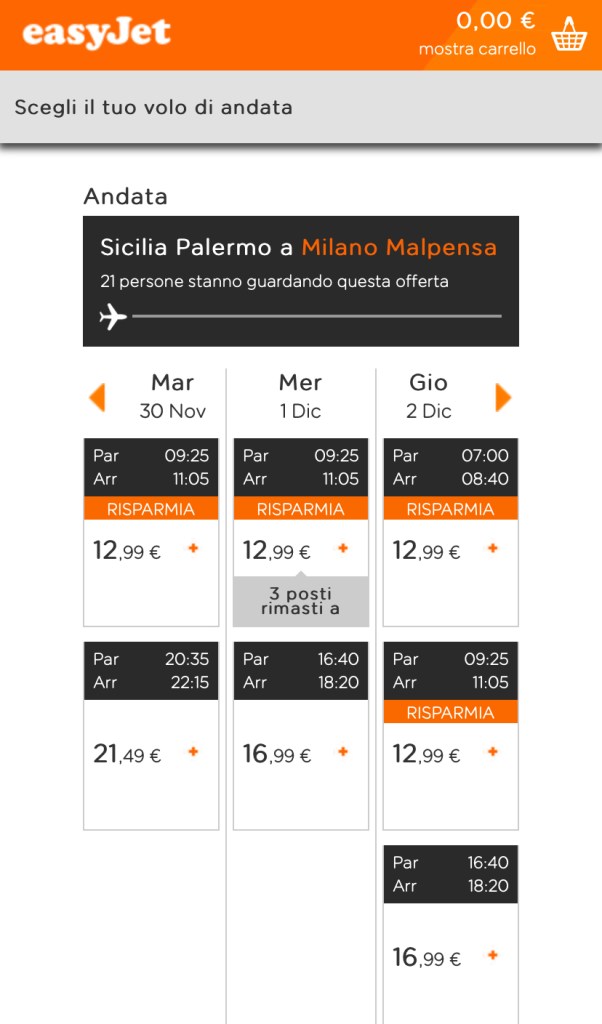 Sicuramente uscire ”dalle secche” dell’eccessiva concorrenza del senso contrario, dove si trova sia Ryanair, che Wizz. Infatti sul segmento Palermo – Milano Malpensa entrambe volano piu’ tardi: alle 8:30 Wizzair e Ryanair alle 9:10. easyJet con il volo alle 7 e’ la prima su Malpensa da Palermo. L’unica concorrente e’ ITA – Italia Trasporto Aereo, ma vola su Linate.