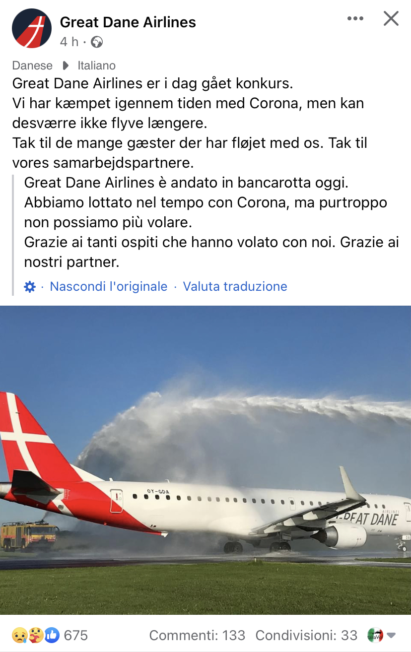 Con un immagine felice come il water cannon salute sui social di Great Dane Airlines, la compagnia aerea danese informa che e’ arrivata al capolinea dichiarando bancarotta.