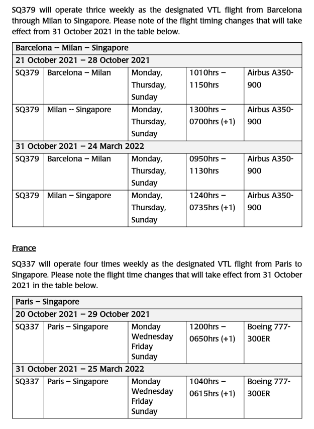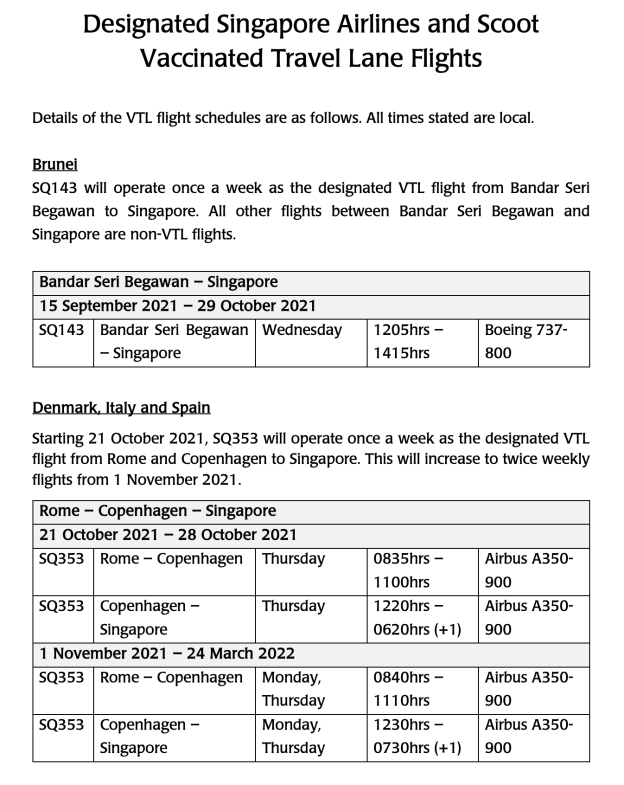 Singapore Airlines opererà servizi VTL da Amsterdam, Barcellona, Copenaghen, Londra, Los Angeles, Milano, New York, Parigi e Roma a partire dal 19 ottobre 2021. I servizi VTL di SIA da Seoul inizieranno il 16 novembre 2021. Oggi SIA opera Servizi VTL da Bandar Seri Begawan, Francoforte e Monaco.