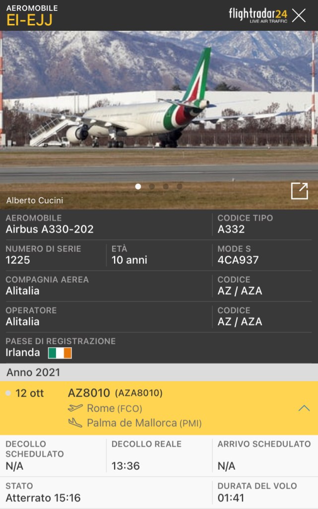 E’ un presumibile ritorno al lessor, quello di oggi di un A330-202 Alitalia EI-EJJ. Con il volo AZ8010 e’ decollato da Roma Fiumicino a Palma de Maiorca.
