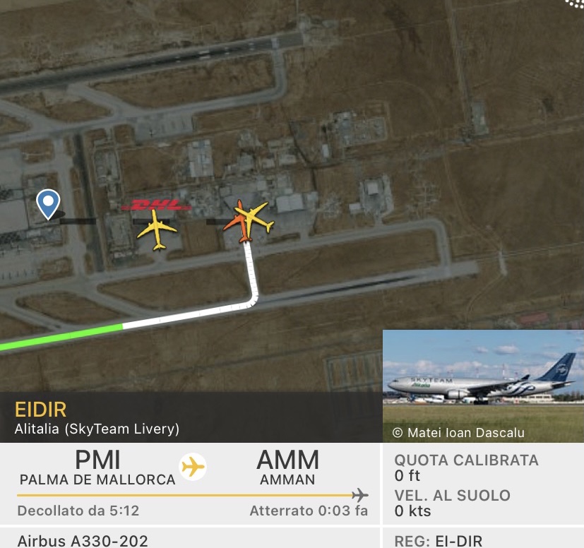 Quest’oggi dall’aeroporto spagnolo e’ transitato il A330-202 a suo tempo restituito da Alitalia a AerCap con un volo su Castellon. Da questo aeroporto con le marche EI-DIR come codice di chiamata e’ partito proprio per Palma de Maiorca e quindi ha proseguito per Amman dove e’ stato parcheggiato alla Jaramco di DAE.