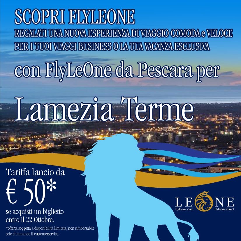 Acquista il tuo biglietto entro il 22 ottobre approfittando della spettacolare promozione FlyLeOne da Pescara a Lamezia Terme con la tariffa lancio a partire da 50€.