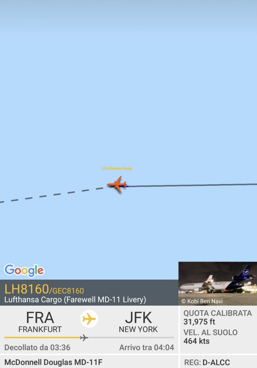 In questo momento e’ sui cieli dell’Atlantico tra Francoforte e New York JFK.