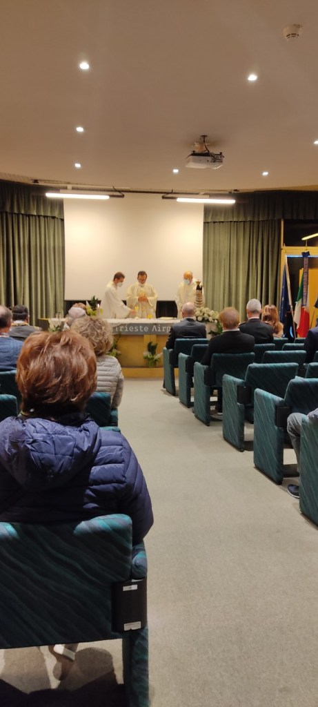 La cerimonia è stata celebrata da don Ignazio Sudoso, arciprete di Ronchi dei Legionari, unitamente ai sacerdoti don Umberto Bottacin e don Mirko Franetovich, alla presenza della Direttrice Aeroportuale Nord Est dell’Ente Nazionale per l’Aviazione Civile, dott.ssa Roberta Carli, al Presidente di Trieste Airport, dott. Antonio Marano, e ai rappresentanti degli Enti di Stato e dell’aviazione che operano presso lo scalo e la regione Friuli Venezia Giulia.