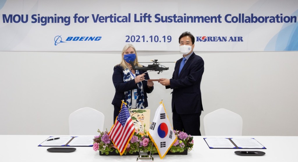Korean Air ha firmato un memorandum d’intesa (MOU) con Boeing in merito a una cooperazione tecnica per migliorare le capacità di manutenzione degli aerei a sollevamento verticale dell’esercito della Repubblica di Corea.