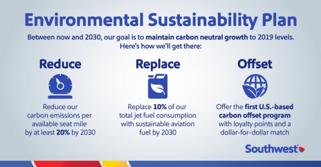 Il piano decennale di Southwest per mantenere la neutralità del carbonio ai livelli del 2019 continuando a far crescere le sue operazioni include piani per ridurre, sostituire e compensare. Inoltre, la Società continuerà a collaborare con organizzazioni e organizzazioni non profit il cui lavoro integra i suoi sforzi per migliorare la sostenibilità ambientale e inviterà i Clienti a unirsi a questo sforzo per mostrare gentilezza verso il nostro pianeta.