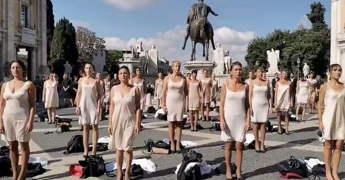 Le ex assistenti di volo sono rimaste in fila in una piazza in cima al Campidoglio di Roma, a piedi nudi, indossando solo una sottoveste, in silenzio per alcuni minuti.