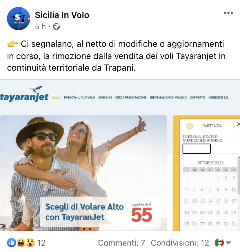 Leggiamo su Facebook sulla pagina di Sicilia in Volo, che i voli della Tayaranjet per le tre rotte della continuità territoriale da Trapani per Perugia, Ancona e Trieste non sono piu’ prenotabili.